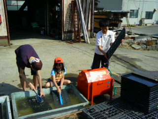 ・苗箱洗いをする子供たち